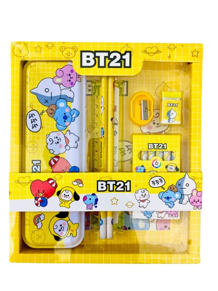 Latest 12 piece. All in One BTS/BT21 Cartoon Theme Stationery Set. Trendy school supplies, Stationery Gift Set Kit with 1 Pencil Box Case 2 Pencils 6 Crayon Colors 2 Space Gel Pen 1 Ruler Scale Eraser Sharpener Kit for Kids. DIY Creativity Art Craft Birthday Party and Return Gift option.